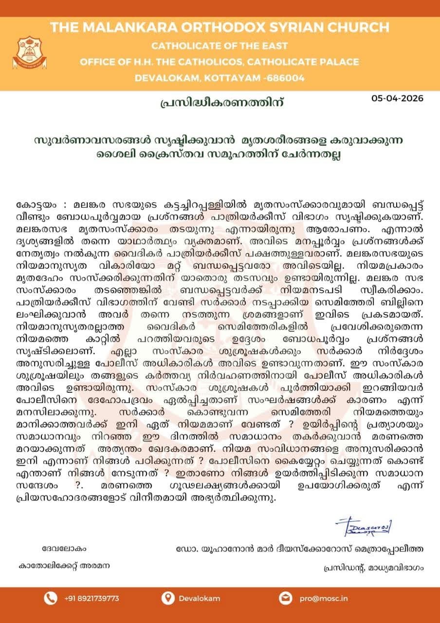 സംഭവത്തിൽ പ്രതികരണവുമായി സഭാ മാധ്യമ വിഭാഗം.ഓർത്തഡോക്സ് സഭ ശവ സംസ്കാരം തടസ്സപ്പെടുത്തിയെങ്കിൽ നിയമ നടപടികൾ സ്വീകരിക്കണമെന്ന നിലപാട് മുതലെടുപ്പിന് ഇറങ്ങിയ യാക്കോബായ വിഭാഗത്തിന് തിരിച്ചടിയായി.