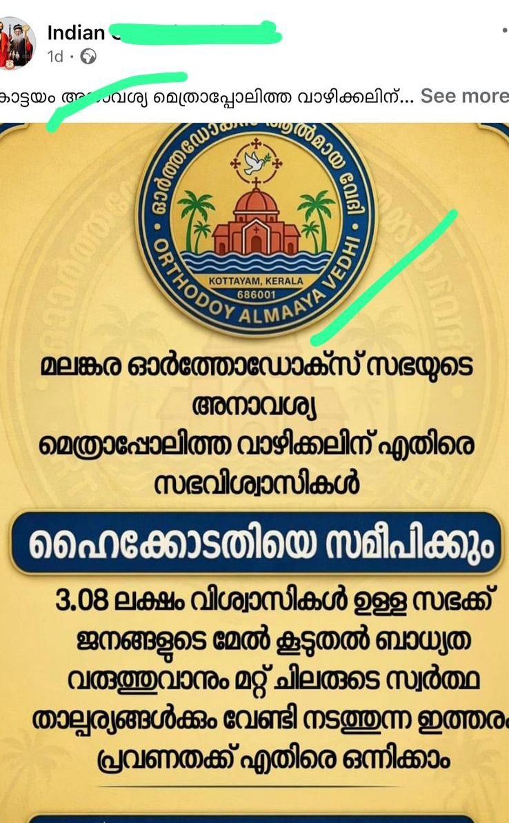 മലങ്കര അസോസിയേഷൻ എതിരെ ഓർത്തഡോക്സ് സഭ വിശ്വാസികൾ ഹൈക്കോടതിയിലേക്ക് വ്യാജ പ്രചരണം വിരൽ ചൂണ്ടുന്നത് ആശയക്കുഴപ്പം സൃഷ്ടിക്കാനുള്ള ഗൂഡലക്ഷ്യം.ഇന്ത്യൻ പൗരൻ അല്ലാത്തവർ എങ്ങനെ വോട്ട് ചെയ്യുമെന്ന നിലവാരം കുറഞ്ഞ ക്യാപ്സൂൾ തെളിയുന്നത് മലങ്കര അസോസിയേഷൻ മെത്രാപ്പോലീത്താ തിരെഞ്ഞെടുപ്പ് വാർത്തകളിൽ നിറയുന്നതിലുള്ള അസംതൃപ്തി യാക്കോബായ വിഭാഗം ഒളിച്ചു കടത്താൻ ശ്രമത്തിന്റെ ഭാഗം.